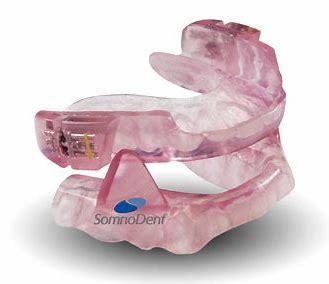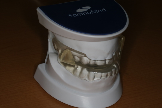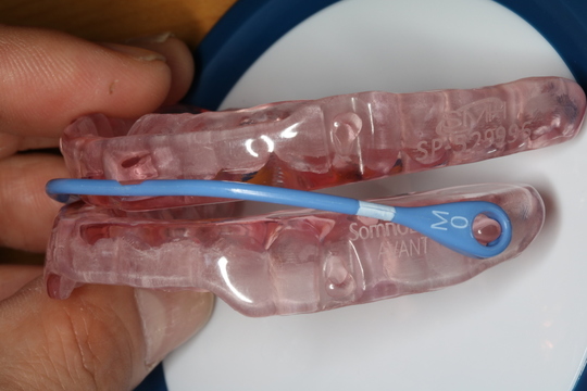 睡眠時無呼吸症候群(SAS)に対してスリープスプリントが保険診療に組み込まれて、各種形態のスプリントが出てきましたが、左上の写真のSomnoMed社の上下分離型のSomnoDent MASが下顎の前方誘導量の調整が適宜できるよう調節用スクリューが埋め込まれているタイプのスリープスプリントです。後で調整ができるのが特徴ですが自費診療となります。