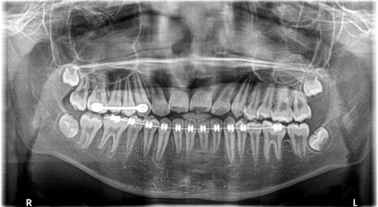 しかし真ん中の写真はその6年後の2020年13歳になりますが左下第二大臼歯が横に倒れて手前の歯にぶつかっている様子が確認できます。このままでは歯が生えてこられません。右はしの写真が2021年14歳時の様子です。ワイヤー矯正により歯の軸がまっすぐ起きて適切な位置に並びました。そのさらに後ろには親知らずが出来始めておりやはり将来横に向いて手前の歯にぶつかるようになるので親知らずは将来抜歯の可能性が高いです。このケースは最終的に全体的な上下のワイヤー矯正により仕上げました。