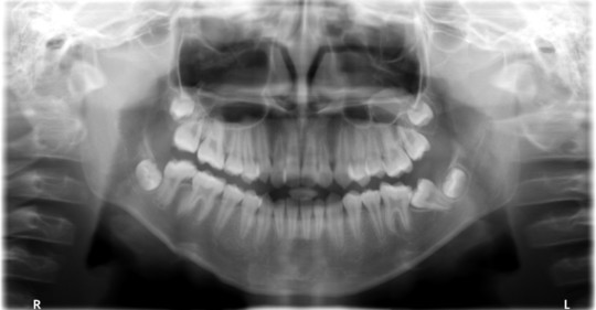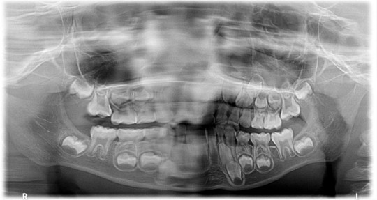 左下第二大臼歯の萌出障がいのケースです。上の左はしのレントゲン写真は2014年7歳当時のものですが左下第二大臼歯はまっすぐの方向であごの骨の中ででき始めています。