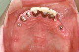 | 施術の説明 | 上顎の保存不可能な2本の天然歯を抜歯後総義歯を装着していたが、骨の吸収が全体的に高度に進んでいたため総義歯が安定せず、十分な満足が得られないため固定式インプラントを希望された。インフォームドコンセントにより7本のインプラントによる固定式ブリッジを選択されたのでカムログインプラントを7本埋入し十分な安静期間を経て固定式ブリッジを製作し装着した。 |