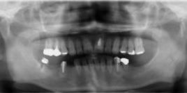 | 施術の説明 | 上あごの歯は重度の歯周病によりすべて抜歯し、その後オールオン6を行った。 インプラント6本で固定式のジルコニアセラミックブリッジを支える構造とした。 下あごの歯は右下奥歯1本を残しそれ以外は抜歯となった。その後前歯2本に インプラントを埋入し取り外し式のボタンタイプの総入れ歯を作製した。 |