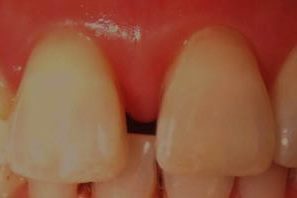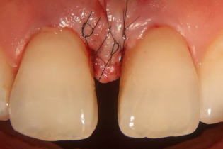 顕微鏡下で歯ぐきの外科処置を行い歯ぐきの治癒を妨げないよう髪の毛より細い縫合糸(7-0ナイロン)にて縫合した後の写真です。肉眼では取扱いの困難なほど細い糸なので歯ぐきも綺麗に治癒してきます。